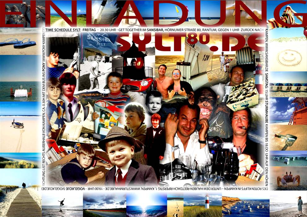 Freitag, 27. Oktober 2006: 20.30 Uhr Get together Sansibar, Hörnumer Straße 80, Rantum, gegen 1 Uhr zurück nach Kampen, www.sansibar.de Samstag, 28. Oktober 2006.: 15.00 Uhr Sturmhaube Kampen bis 18.oo Uhr auf den Höhen des Roten Kliffs in Kampen – unter dem Hauben-Reetdach- Riperstig 1, Kampen, www.sturmhaube.de 19.00 Uhr Vogelkoje www.vogelkoje.de (schöne Bilder), ist nicht auf dem Kampener Ortsplan, Richtung List liegt das Restaurant rechts außerhalb von Kampen. gegen 0.30 Uhr mit dem Bus ins Pony, www.pony-kampen.de for more Information pls. contact: Sabine Michaelis +49 163 35 35 108 michaelissabine@hotmail.com party@sylt80.de Jürgen Boden & Peter Nöthen |